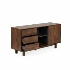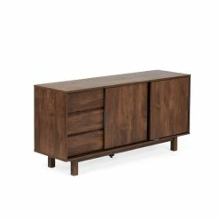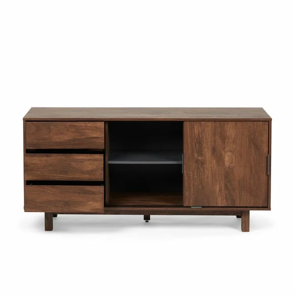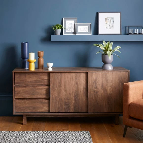 Boasting ample storage space, the Carson Large Sideboard features three spacious drawers with metal runners as well as two sliding doors that open to reveal large cupboards with fixed shelves.
