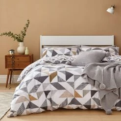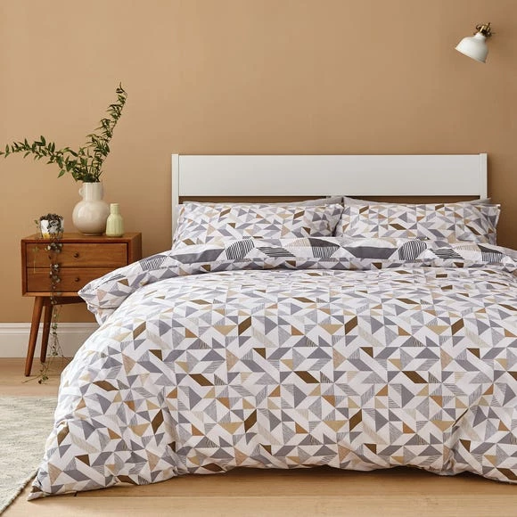 From our elements collection, this duvet cover and pillowcase set features a silver and gold geometric design on a subtle neutral colourway. Accompanying a larger print on the face and smaller on the reverse, for a quick bedroom style change. Crafted from a soft, durable polycotton blend, this duvet cover and pillowcase set is easy to care for at home and comes in a range of sizes.