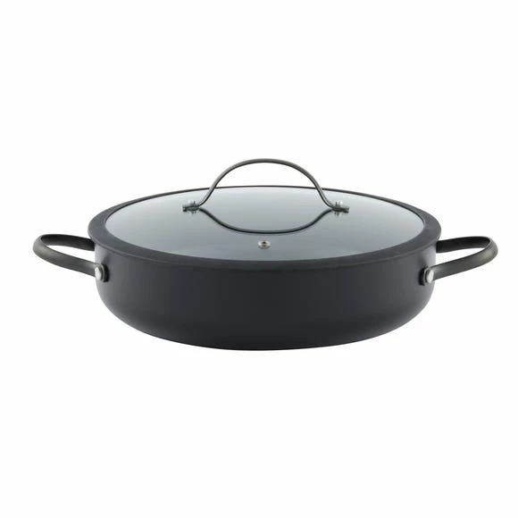 Suitable for use on all cookers, including induction, this pan with a scratch resistant ceramic non-stick has a glass lid and silicone rim. With handles made from cast stainless steel, this piece is both dishwasher and oven safe, up to 220 degrees.