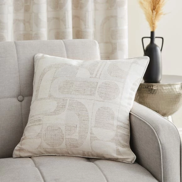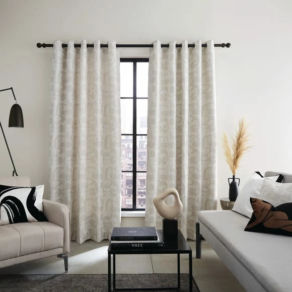 Part of the Elements Range, the modern and stylish Elements Curves Jacquard Sandstone Eyelet Curtains will add a welcoming touch to your living areas. Crafted beautifully with a lining made from 100% recycled materials, the curtains are finished with durable brushed steel eyelets, making them super easy to install. Available in a choice of sizes, the co-ordinating cushion is also available.
