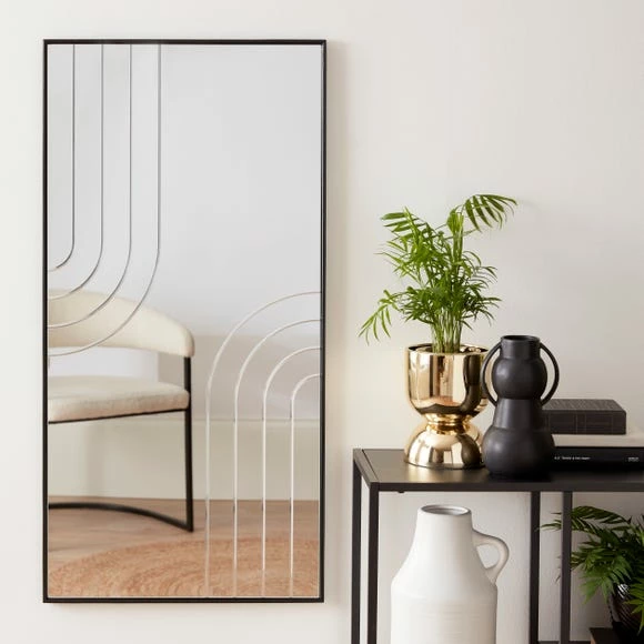 Add a contemporary, modern look into your home by hanging this stunning Elements Etched Mirror. Beautifully crafted with an etched mirror design and black frame. This mirror will make a statement piece in any room of your home and comes with hooks wall fixings.