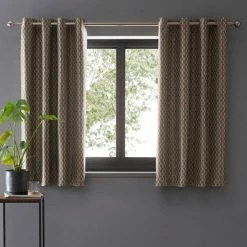 The face fabric boasts a modern geometric design in a ochre colourway, perfect for adding some colour into your home. The polyester lining will help preserve the design and front fabric from fading, making these curtains long-lasting. Complete with a smart eyelet header, these curtains are designed for use with a curtain pole. Coordinate the curtains with the matching cushion for a stylish room look.