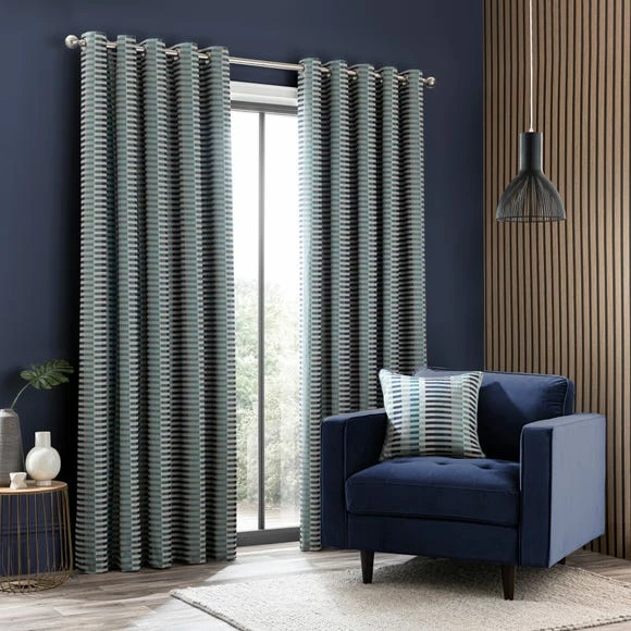 Finish your home with the beautifully crafted Elements Kansas Stripe Navy Eyelet Curtains, adding a welcoming touch to your living areas. Made with a 100% recycled polyester lining, the curtains have a contemporary striped jacquard design and can be paired with the matching cushion to give your home a co-ordinated look.