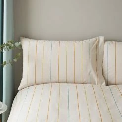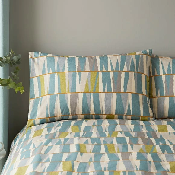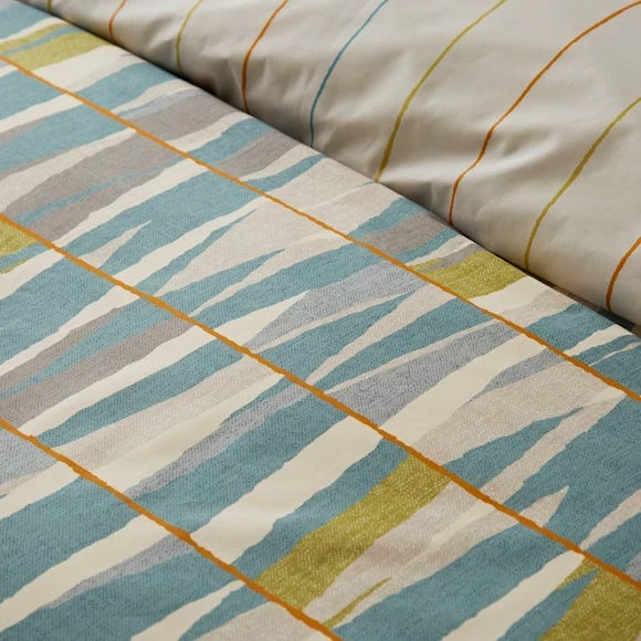 Beautifully crafted from 100% cotton fabric, This Elements Kolla duvet cover and pillowcase set features a printed torn stripe design with blue, green and natural tones. On the reversible side, an alternative stripe design has been printed to give you the opportunity of a quick style change. This duvet cover set comes with 2 standard pillowcases but there is a coordinating Oxford pillowcase available.