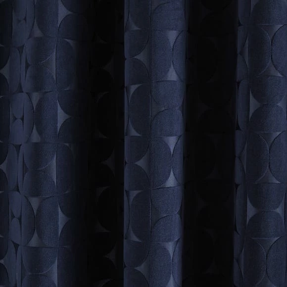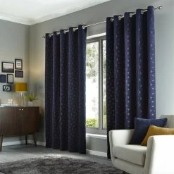 Crafted from soft and smooth jacquard velour fabric for a beautiful texture, these navy eyelet curtains feature a modern geometric design and are ideal for bringing a touch of contemporary style to your home. These curtains are equipped with a silver eyelet header for easy hanging and produce a stunning undulating drape for a sophisticated appearance. Fully lined for improved insulation and increased privacy, these curtains are great for use in all seasons and bring a stylish touch to any room. These curtains are available in a range of sizes to suit your requirements and a coordinating cushion is available to purchase separately.