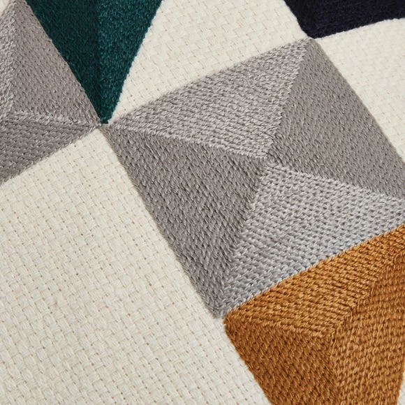 Stylish and contemporary, this modern Elements cushion features a crewel embroidery geometric design and is fashioned from a cotton blend for a beautiful texture. Completed with a plain navy reverse for added versatility, this cushion is perfect for bringing a modern edge to any room. This cushion is generously filled with plump and durable polyester for lasting fullness and maximum comfort and features a machine washable cover for easy care.