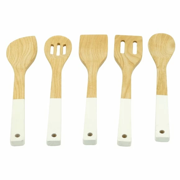 Made from ashwood with white handle detail, this set of 5 utensils comes complete with 2 spoons, 1 slotted turner and 2 spatulas.