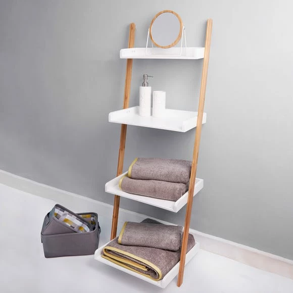 Designed with a space saving structure, this wooden ladder shelves unit is made from durable bamboo, featuring shelves of varying sizes.